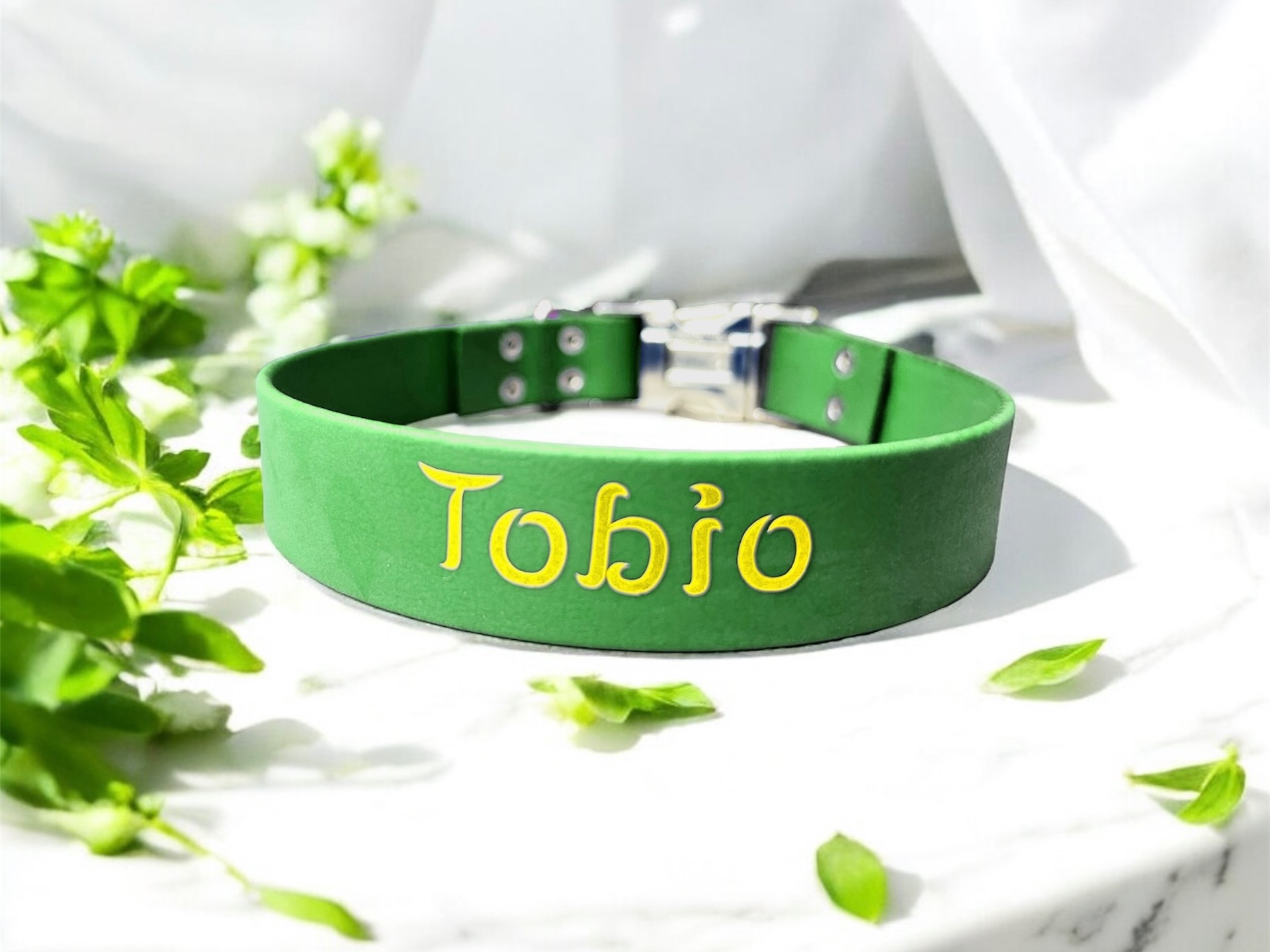 Chaque collier est réalisé avec soin, dans un matériau imperméable, le biothane, résistant et facile à entretenir, parfait pour accompagner votre compagnon dans toutes ses aventures.
