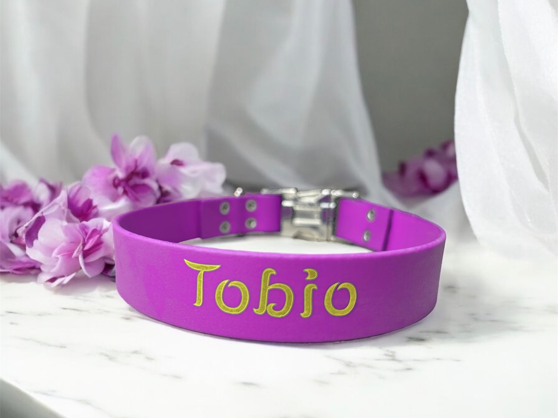 Chaque collier est réalisé avec soin, dans un matériau imperméable, le biothane, résistant et facile à entretenir, parfait pour accompagner votre compagnon dans toutes ses aventures.