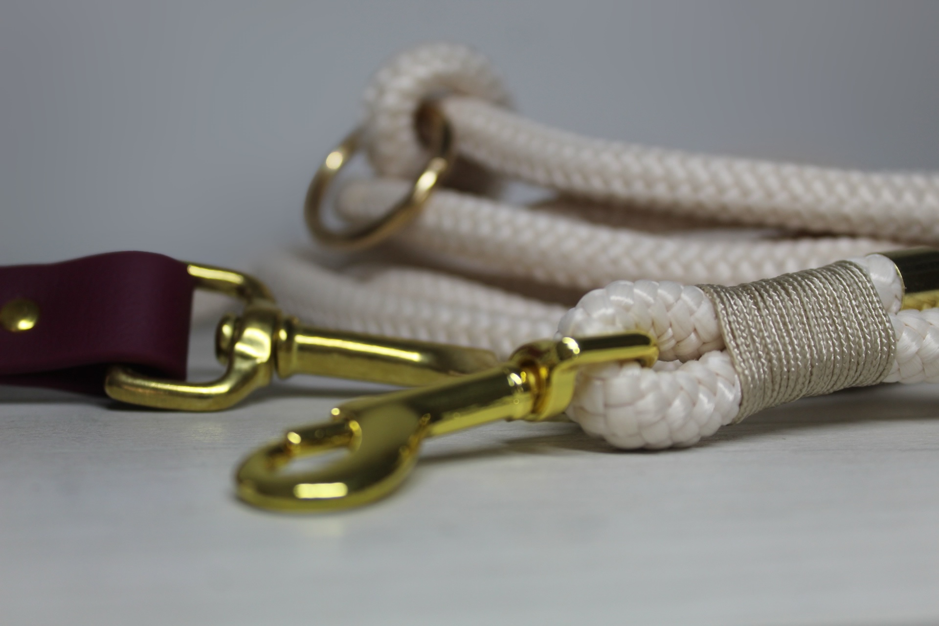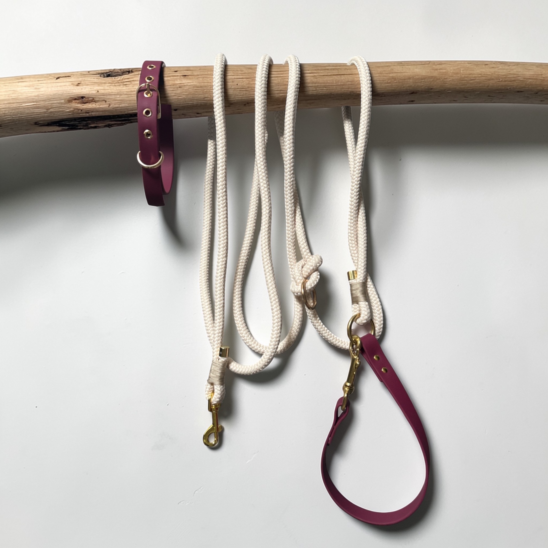 Le modèle Aphrodite est conçu avec une corde PPM beige de 1cm de largeur, à la fois résistante, souple & agréable en mains. Sa poignée en biothane Vin Rouge apporte un excellent confort de prise tout en ajoutant un touche de style unique.