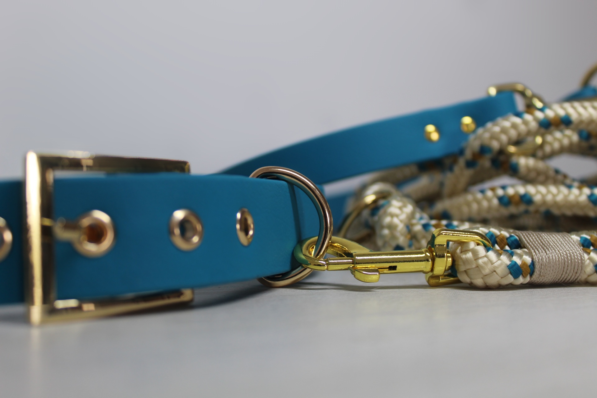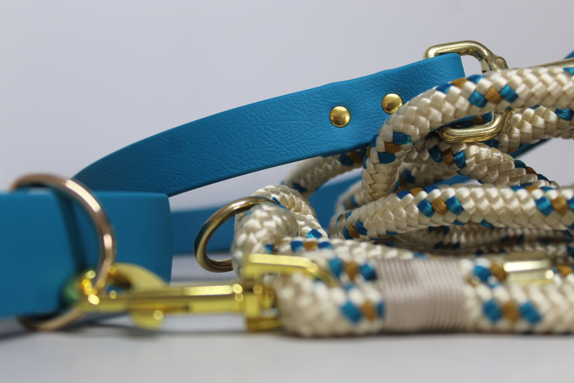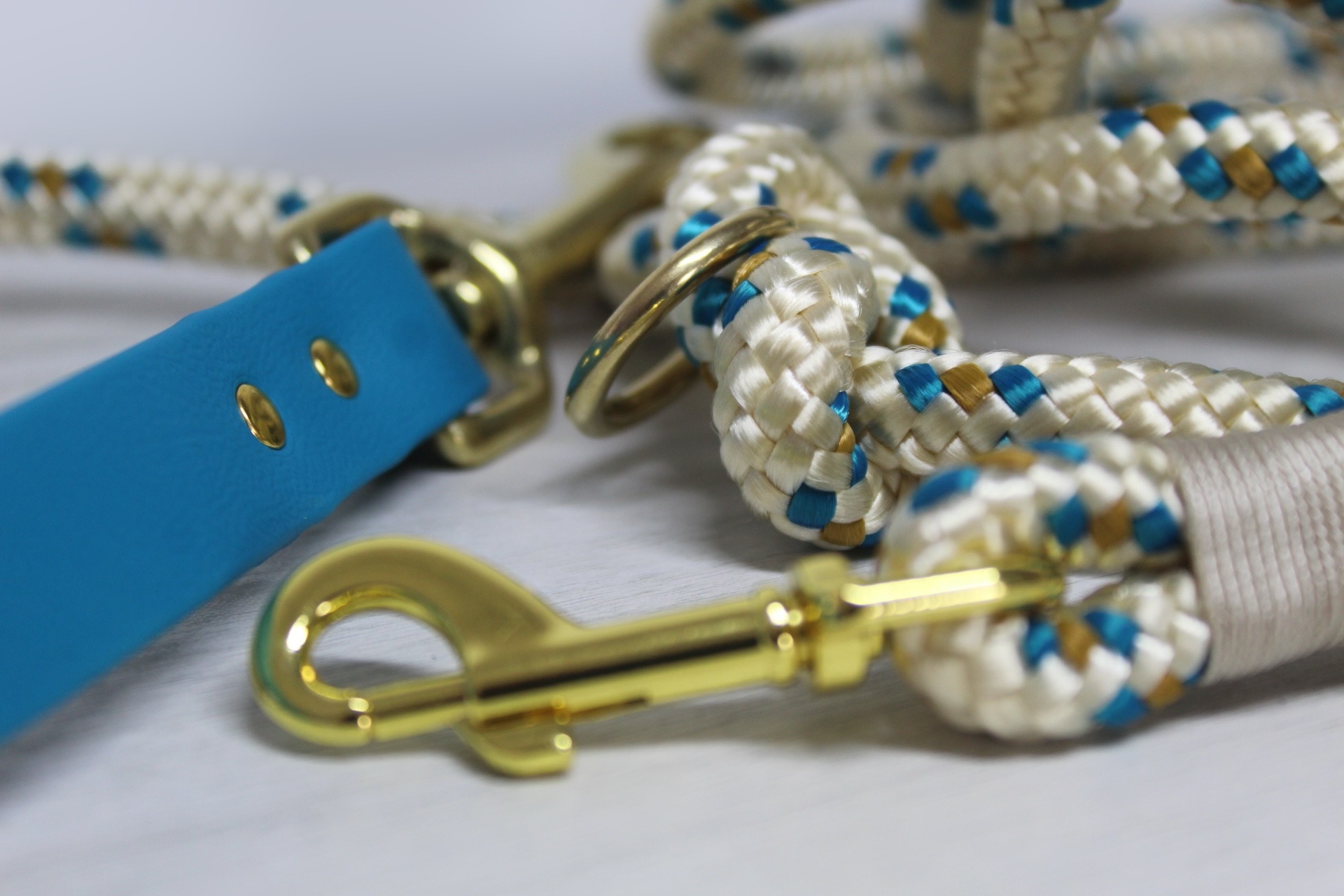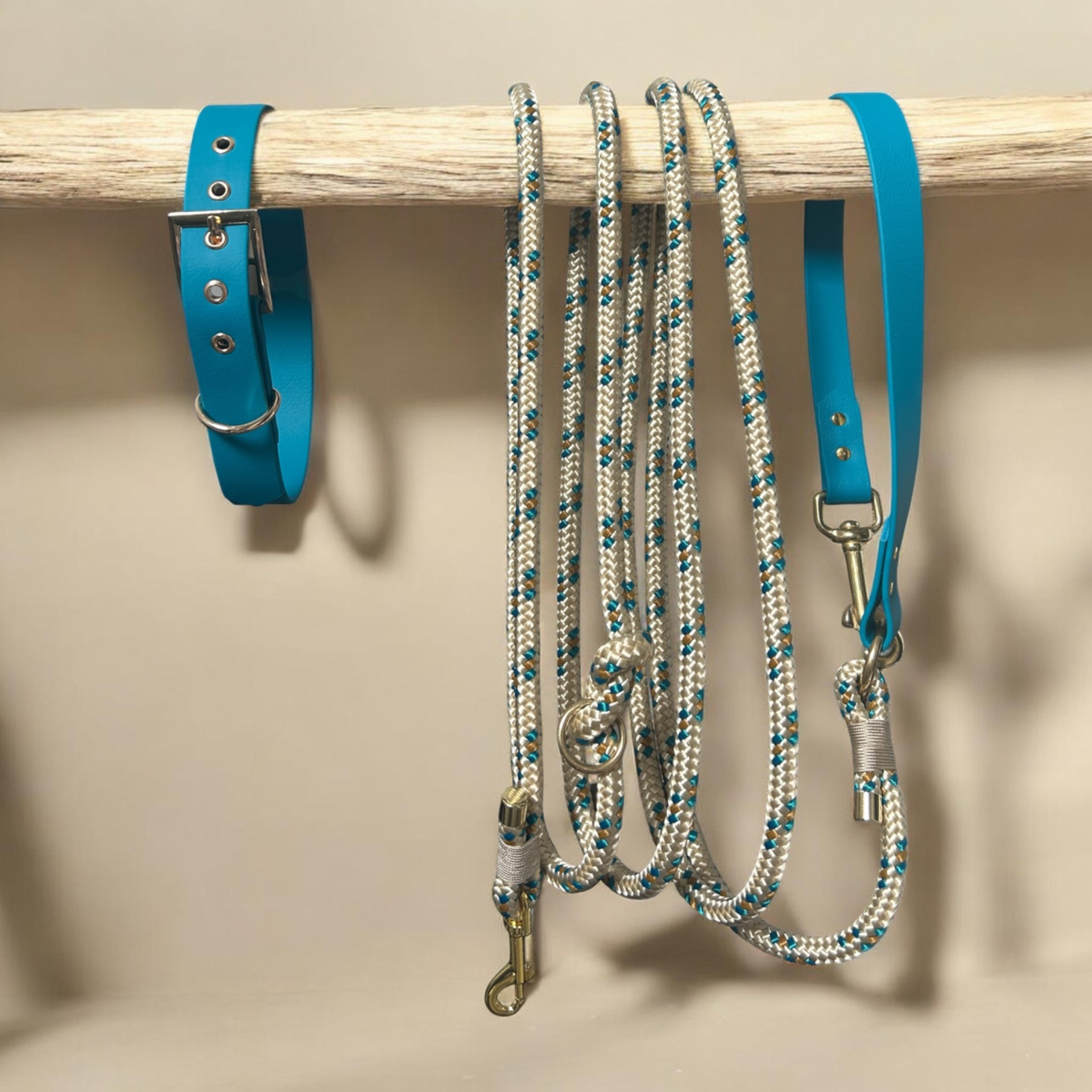 Le modèle Heimdallr est conçu avec une corde PPM aux tons dorés & bleu pastel de 1cm de largeur, à la fois résistante, souple & agréable en mains qui rappelle les profondeurs marines et les rivages sableux. Sa poignée en biothane Lagune apporte un excellent confort de prise tout en ajoutant un touche de style unique.
