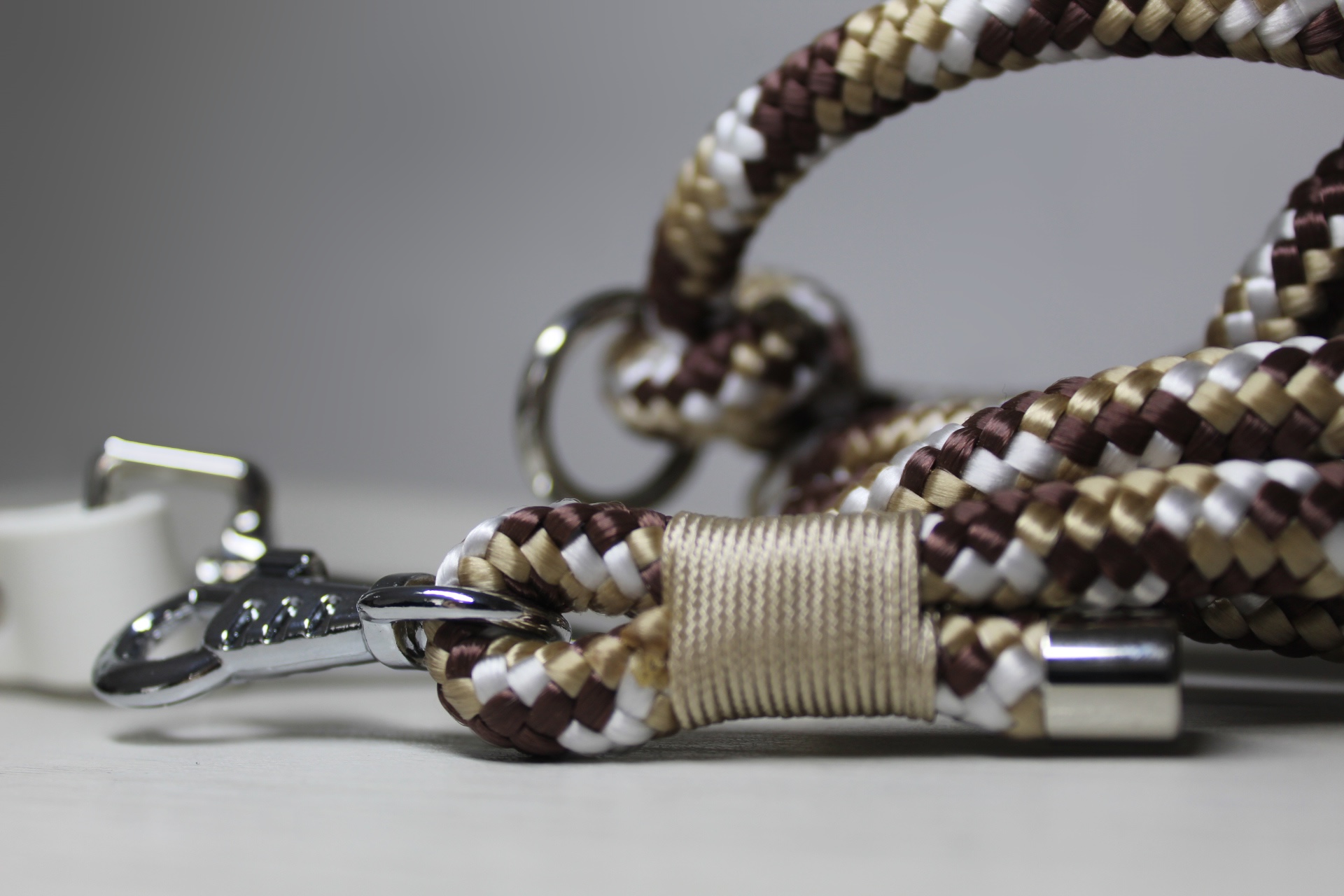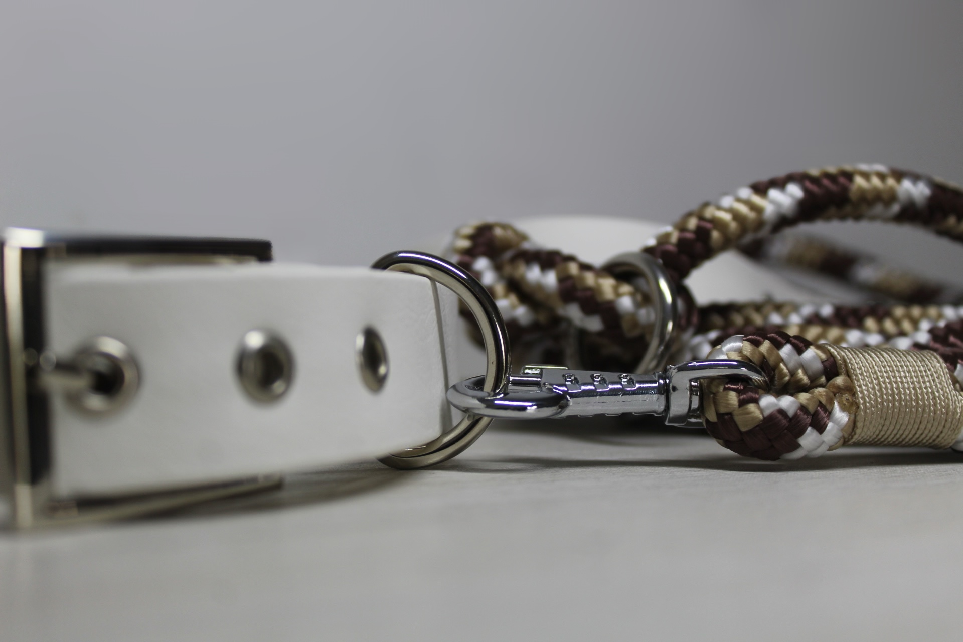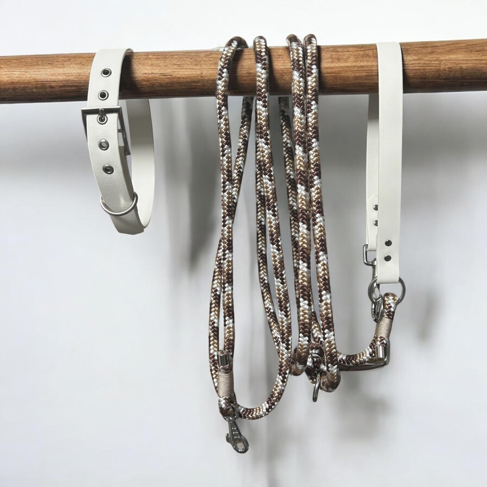 Le modèle Jörmungandr est conçue avec une corde PPM aux tons marronnés & blancs de 1cm de largeur, à la fois résistante, souple & agréable en mains qui rappelle les profondeurs marines et les rivages sableux. Sa poignée en biothane Blanche apporte un excellent confort de prise tout en ajoutant un touche de style unique.